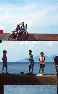 Dopo una intera giornata di sobbalzi lungo l’isola, varie tappe, alcune incomprensibili, e tentativi falliti di conversazione con il buon Angelino eccoci arrivati a Moni, nell’interno, ai piedi del vulcano che domattina visiteremo. Troviamo alloggio e dopo una passeggiata tra le risaie scopriamo il nostro piccolo paradiso: pozza d’acqua tiepida e una cascata tra le rocce. Via i pantaloni e ci tuffiamo. Sarà l’atmosfera, sarà la stanchezza, ecco il colpo di genio in agguato: “Nuotiamo fin sotto la cascata, sì, dai, dai…” Detto fatto eccoci sotto il potente getto d’acqua che…in secondi due, netti, ci trascina a fondo in un gorgo imprevisto. Riusciamo ad uscirne non si sa bene come solo dopo aver bevuto un bel po’: alla faccia delle infezioni intestinali! Che fare ? Spezzare il momento magico e poetico, mettersi due dita in gola e… torniamo mogi verso il nostro giaciglio ricoprendoci di insulti. Forse nessuno ci ha visti. Speriamo.